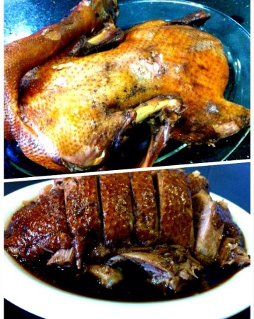 2.上架,200℃转烤55分钟,晾凉切片同京葱、面酱卷饼食用,鸭架煮汤。