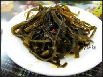 1 将海带洗净,灼熟后捞出,放冷后切丝,放入盘中