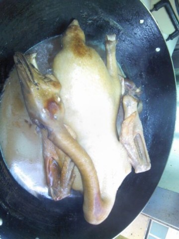 4、将花生油烧滚,再将一整只鹅全部炸5分中表皮脆了拿起来,倒掉油,放入水满过鹅背,直接卤到水干,再小火卤!大概卤一个半小时捞起,剁!