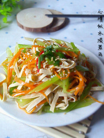 灿烂小叮咛: 各种食材尽量把丝切细一些,看大家的刀功如何了~~ 醋建议用白醋,不影响菜品的色泽。 豆皮丝一定要焯水。