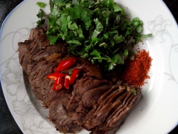 5、取出切成薄片装盘,再配上香菜或者辣椒粉和花椒粉盐沾起吃,味道不错。