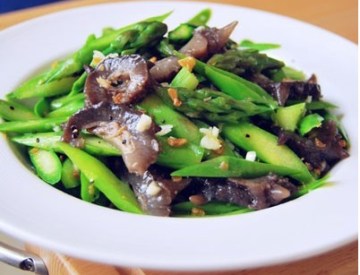 5.焯好的芦笋和海参混合,添加一半的蒜蓉、1/2茶匙盐和白糖拌匀。6.起油锅,下入橄榄油,煸香另一半蒜蓉至淡黄色,同时添加一些黑胡椒粒煸香,炸好的黄金蒜蓉连同油一起,浇在拌好的芦笋海参上,拌匀即可。