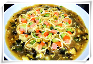 在夏天吃时,我们在做好后可以用保鲜膜盖好放冰箱冷藏一会儿,那冰冰凉凉的感觉会更妙的^_^ 此菜是为《动动画世界》杂志所作,原名为【蜂蜜鸡蛋卷】^_^
