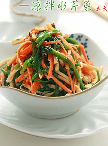 1 将水芹菜清洗干净,焯水备用;