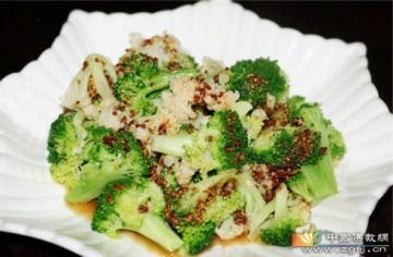 菜花200克,西兰花200克。调料精盐1/2小匙,味精1/2小匙,蒜泥少许,葱油1小匙。
