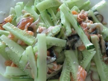 (也可用三文鱼皮,在沸水里捞过,冷却后,一起凉拌)