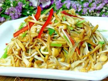 金针菇也可以搭配干豆腐丝、莴苣丝、白菜丝、胡萝卜丝、火腿丝、海蜇丝等