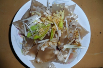 4、切块,加酱油、醋拌匀,再把葱姜洒在上面就ok了。
