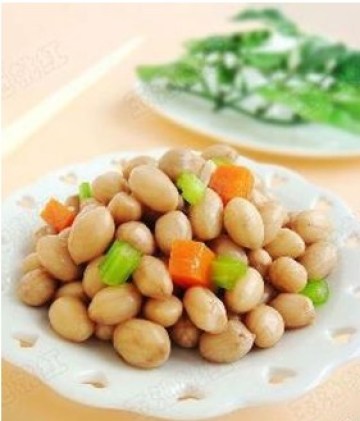 3.让花生米泡在汤汁中1-2小时会更入味芹菜焯水切断,胡萝卜切丁,加少许盐和醋稍为腌制一会,加入放凉的花生米拌匀,加入少许香油拌匀就可以了