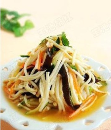 金针菇也可以搭配干豆腐丝、莴苣丝、白菜丝、胡萝卜丝、火腿丝、海蜇丝等