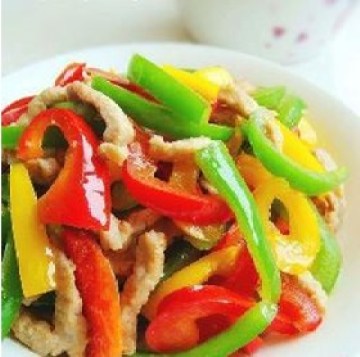 4.炒里脊丝至颜色发白后倒入切好的彩椒丁翻炒1分钟,加入适量的食盐、鸡精翻炒均匀即可