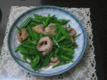 蒜苗200克,熟大肠头一只