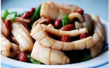 材料:鱿鱼,花生,荷兰豆,杏鲍菇。