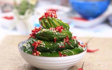 3.将切好的黄瓜用盐腌出水后,冲洗干净摆入盘中,最后浇上汁。