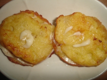 5、在两片土豆饼中间涂上沙拉酱即可。