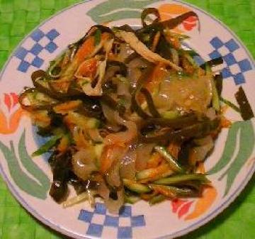 主料:干海带约20克,干粉条约50克(或粉丝),胡萝卜一根,黄瓜半根,干豆腐皮一小块