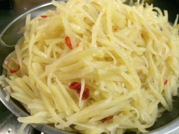 1,土豆丝要切的细而均匀.切不好的可以利用假期到中餐馆去训练半个月