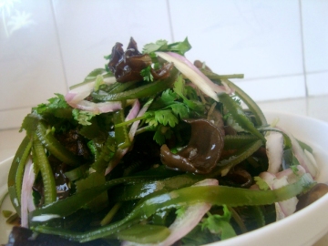 3、洋葱切丝、香菜切段,和木耳海带丝混合,加入盐、醋、味精、蒜泥拌匀。