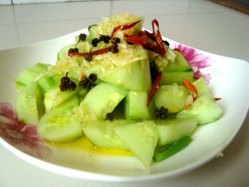 3、热锅凉油,放入花椒粒、干红辣椒丝炒出香味,趁热浇在黄瓜块上即可。