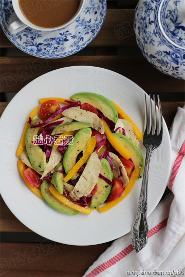 4、将鸡胸肉、牛油果、圣女果、黄椒和紫甘蓝放入碗中,加入柠檬汁、苹果醋、黑胡椒、盐和橄榄油拌匀即可。