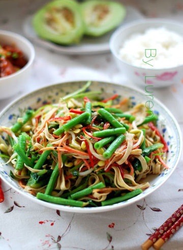 【蔬菜】豇豆、胡萝卜、黄豆芽、莴笋叶、红椒、青椒、豆腐皮、香菜