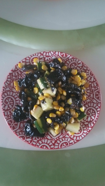2.锅中加适量油,将玉米粒倒入稍炒一下,加少许盐,味精,放凉后,加上一小滴醋(可不加),加少许酱油,倒入木耳及黄瓜拌匀,洒上少许芝麻。