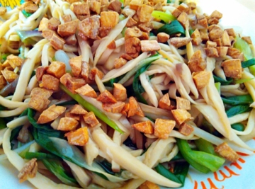 2. 热锅,倒入2大匙油,放入蒜泥以小火爆炒至金黄色即是蒜酥,取出备用。