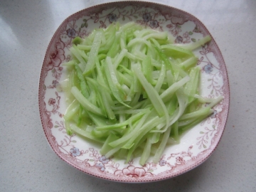 1、佛手瓜洗净切丝,在沸水中烫一下。