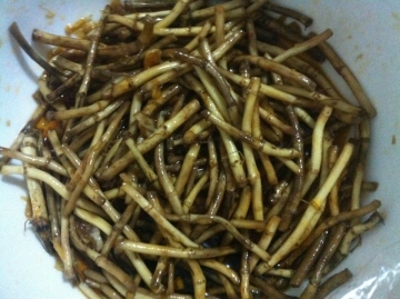 2、把烫好的鱼腥草放入碗中,加入蒜泥、酱油、麻油、花椒油、辣椒油一起拌匀,一开始入味不了,我一般放到冰箱第二天吃味道很好,就像我这样颜色就是入味特别好的了。