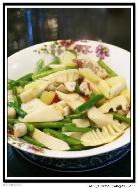1.用到的时令素菜是竹笋、芦笋、蘑菇,竹笋切长滚刀,芦笋切寸段,蘑菇见大小一切为二或四。