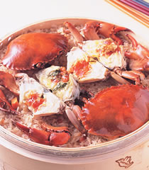 红蟳2只,鸡蛋1个,红萝卜丁1又1/2匙,芋头丁1又1/2匙,长糯米1斤,火腿丁1又1/2匙,沙拉油1又1/2匙,肥油丁2两,油葱1匙,酱油1.7两,糖1/2匙,味素1/2匙,清水100公克,胡椒粉少许,米酒1匙