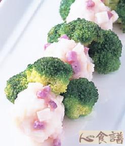 3.调味花枝浆分成均等的4等份后,先以手部虎口捏成圆球状,再将作法1的草虾仁包入,外层再沾裹上作法2的山药丁,再放入蒸锅中以大火蒸约5分钟即取出,与作法2的青花菜一起摆盘。