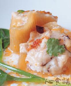2.排翅翅口边缘上抹上少许的太白粉后,再取50公克作法1的虾浆酿于排翅口上,放入蒸锅中以大火蒸约5分钟至变熟。