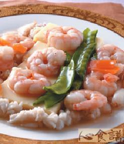 芙蓉豆腐2盒,中卷1尾,虾仁150公克,蟹脚肉150公克,豌豆适量,红萝卜适量,葱1支,姜少许,葱姜水少许,水350㏄,a.芙蓉豆腐汁2包,盐少许,柴鱼素少许,b.香油1/2小匙,料理米酒1小匙,太白粉水适量