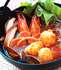 锅底材料:125㏄,泰式酸辣酱2大匙,火锅材料:3只,虾丸3颗,鲜香菇1朵,文蛤3个,冬粉1把