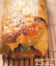 2.将蛋打散,加入调味料,以平底锅煎至蛋底可离锅,再铺上作法1的材料,将蛋慢慢捲成滚筒状起锅,用竹帘稍微整型、切段即可。