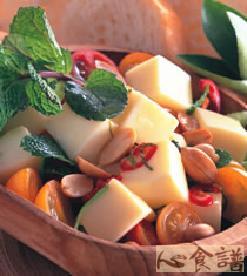2.将芙蓉豆腐切块与小蕃茄、花生粒和酱汁一起拌匀就很泰味了。