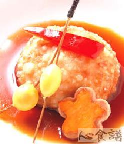 a.面粉100g,日本胡麻酱500g,味醂300g,盐1小匙,日本太白粉200g,水2200g,b.虾子1只,干贝1小块,香菇1小块,银杏2个