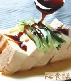 4.取出作法2的豆腐切片,并装盘,再舖上作法3的小黄瓜丝后,淋上作法3的淋汁,即可食用。