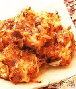 4.先将作法1的豆腐沾裹上作法2的材料后,再放入作法3的钢盆中沾满柴鱼碎片后备用。