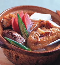 5.取一砂锅,放入作法2、4的材料,注入水与鸡粉调成的高汤后,以中火煮约15分钟,再加入豆腐略煮,以所有调味料调味,上菜前将秋葵摆入即可。