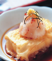 4.起油锅,用中温油将豆腐炸至金黄色,盛入器皿中,放上红叶萝卜泥,淋上作法3的酱汁,上面再撒上柴鱼片即可。