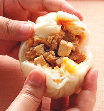 4.把作法3的包子放入蒸笼里,以大火蒸约8~10分钟,熄火后再焖约2分钟即可取出,外皮上以红辣椒丝装饰即可。