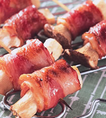 3.取一烤炉,将作法2的培根串放上烤架,烤至培根呈酥脆状即可。