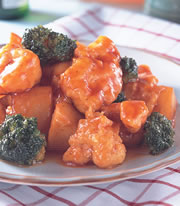 猴头菇罐头2罐,绿花椰菜100公克,马铃薯100公克,姜3片,脆酥粉75公克,水25㏄,太白粉2大匙,醋熘酱汁1/2杯