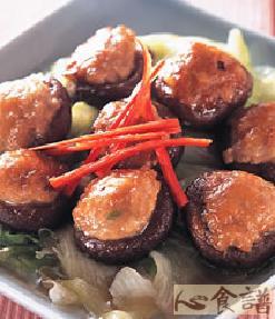 (4)起油锅爆香葱段,加入拌杯水,再加入鲜美露、香油,将作法3的香菇镶肉放入一起煮入味,加少许太白粉水(份量外)勾芡即可。