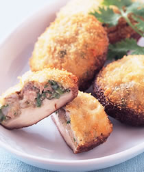 鲜蚵100公克,鲜香菇6朵,绞肉50公克,虾泥100公克,葱末100公克,太白粉少许,面粉100公克,蛋黄2个,面包粉150公克,盐1/2小匙,胡椒粉少许,细糖1/4小匙,香油少许
