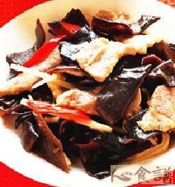 1.干木耳洗净,泡水1小时;猪肉切片、辣椒切片、姜切丝备用。