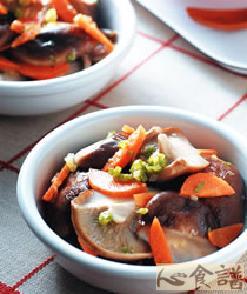 5.将作法2的红萝卜片、作法3的香菇片以及作法4的酱汁一起拌匀即可。