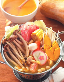 a.南瓜汤头1锅,b.高丽菜适量,综合火锅料适量,综合菇类200公克,南瓜片适量,玉米1段,梅花猪肉片100公克